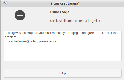 | Veateade ütleb, et tuleb jooksutada käsku "dpkg --configure -a". Seega võtad oma lemmikterminali lahti ja toksid sinna: