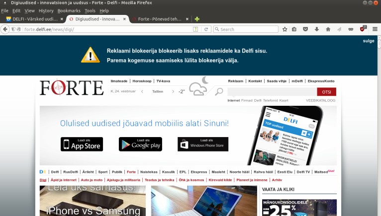 Jah, selle uBlock Origin'iga ongi kuidagi sellised lood et vahepeal justkui töötab ja siis jälle ei tööta Delfis (manuaalne blokeering). Nüüd proovin ja jälle töötab, ehk siis blokeerib Delfi tüütu hoiatuse.