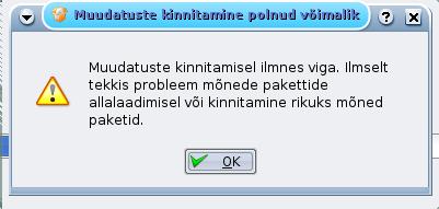 Aga hoopis sellise saan 50% peal nagu pildil. Ja nii järjekindlalt kõigi asjadega - proovisin mitut suvalist programmi installida. Sama lugu. Samas ta installi nagu teeks ära, kui uskuda pärast Installitud programmide nimekirja, aga tööle se küll ei lähe. Terminal ütles näiteks museekd-i kohta: